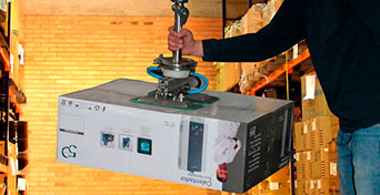 El manipulador de cargas permite el agarre y elevación de bobinas y rollos en la industria textil, metal y gráfica.